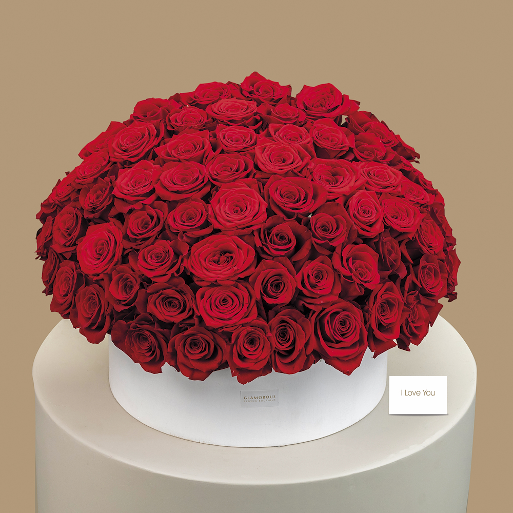 A box containing red roses, arranged in a distinctive way.