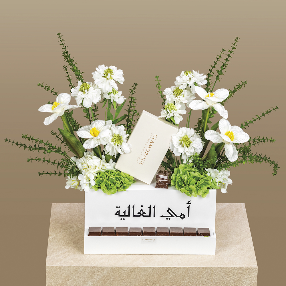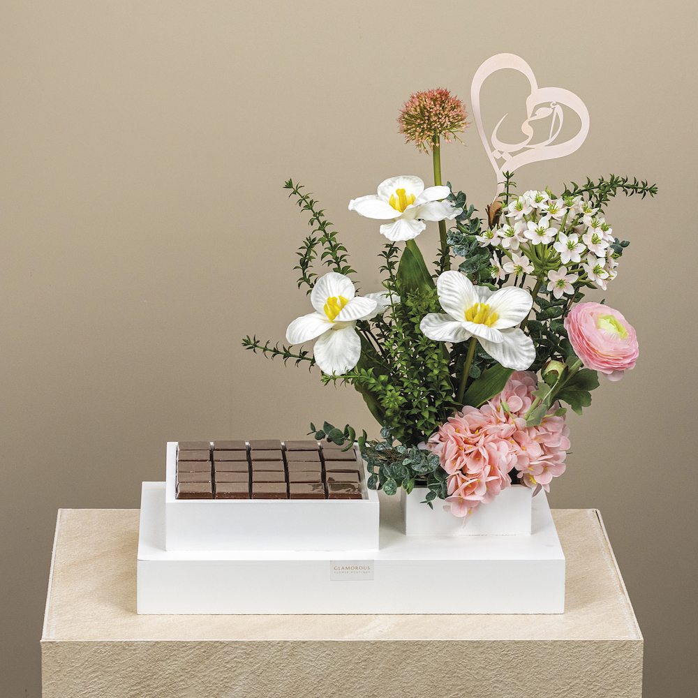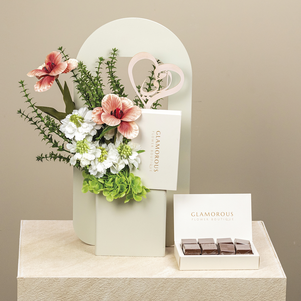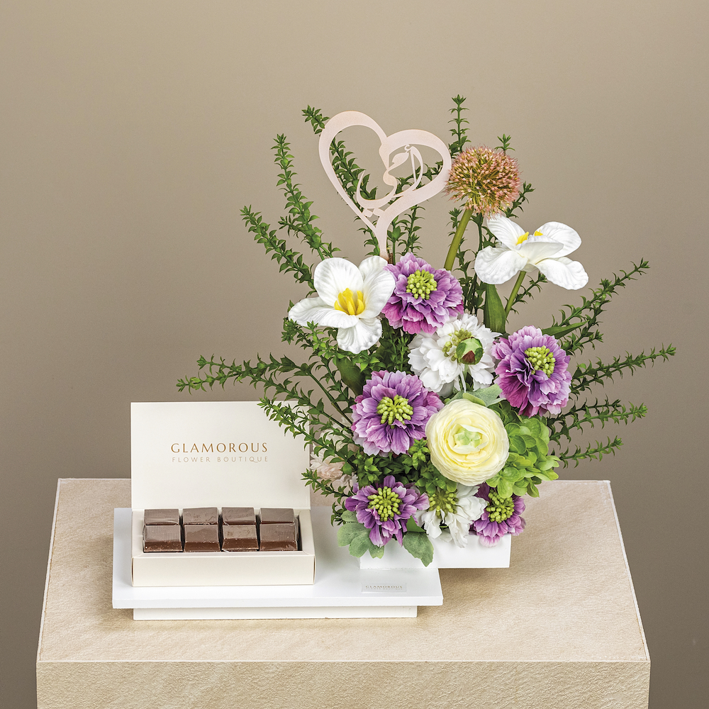 A bouquet containing a mix of natural and artificial flowers, arranged beautifully. Comes with chocolates.