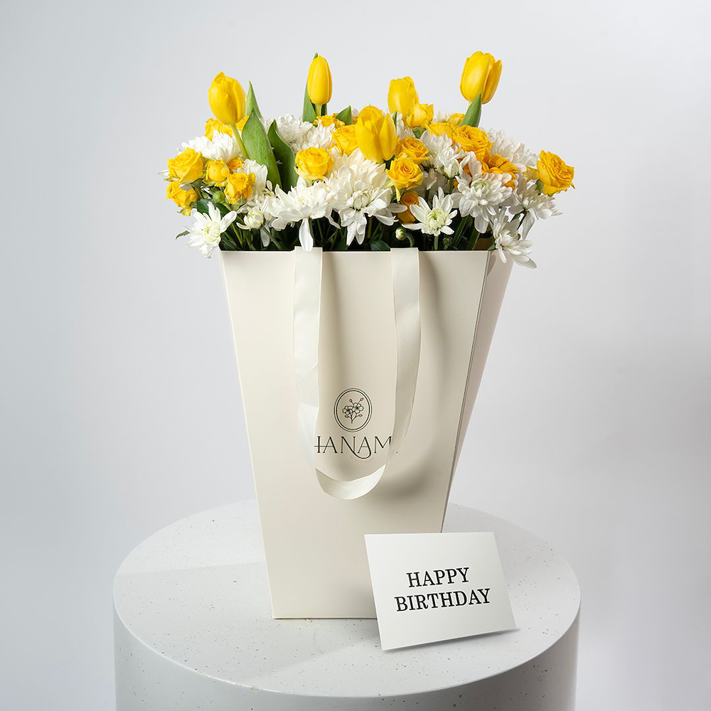 A bouquet that contains tulips, chrysanthemums, and baby roses, beautifully arranged in a bag.