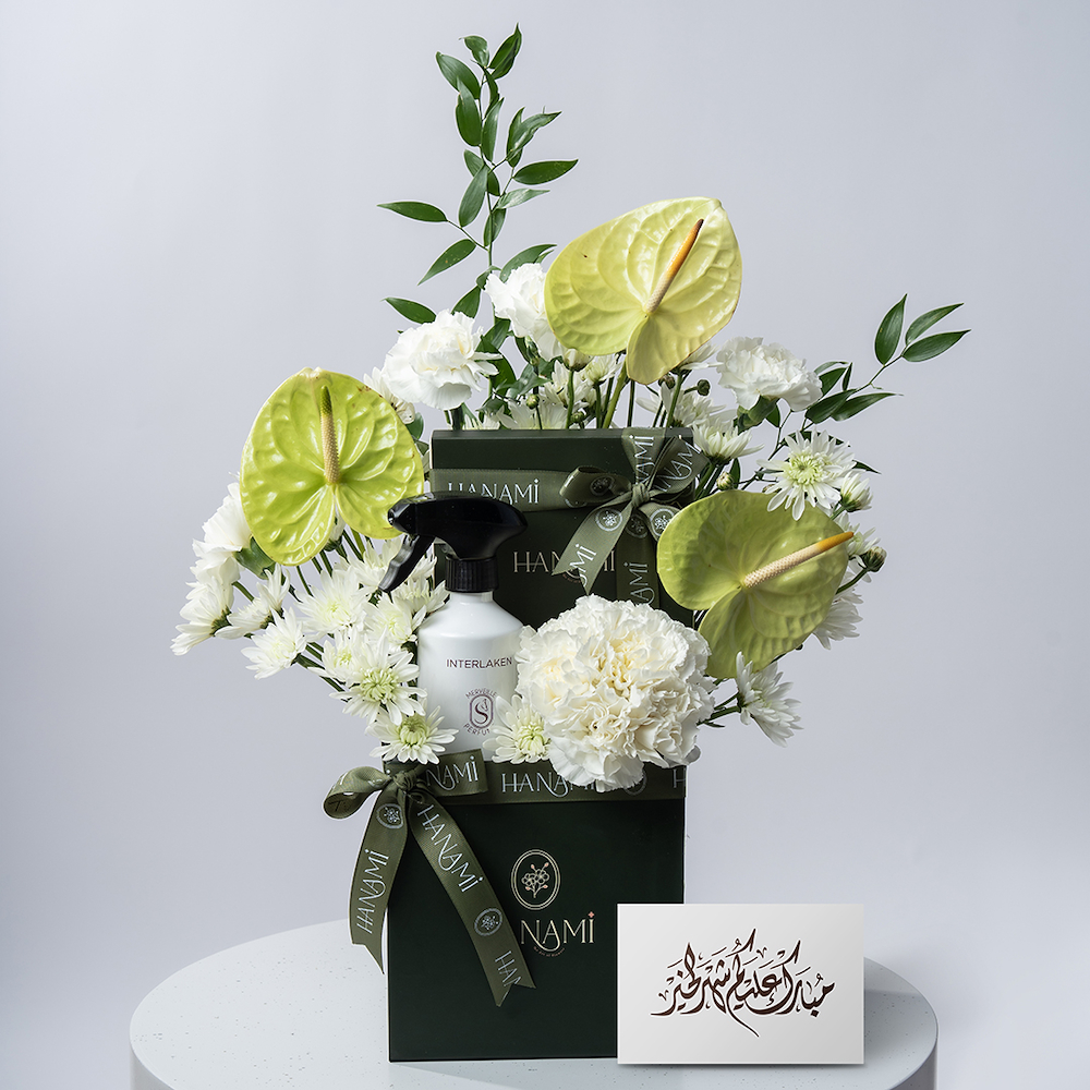 An elegant box featuring anthurium, carnation, chrysanthemum flowers, 18 pieces of Belgian chocolate, and Interlaken 100ml home fragrance from a fruity gourmand chypre fragrance family, top notes of red orange, heart notes of honey, peach, and gardenia, and base notes of patchouli.