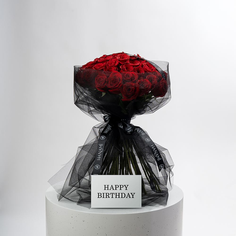 A hand bouquet containing red roses, beautifully arranged.