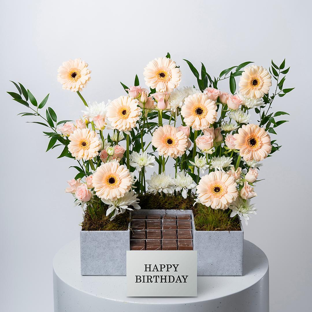 A box that contains baby roses, chrysanthemums, gerberas, and ruscus leaves, beautifully arranged with chocolates. Perfect for celebrating your loved one's special day.