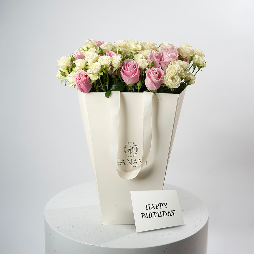 A bouquet that contains pink roses and white baby roses, beautifully arranged in a bag.