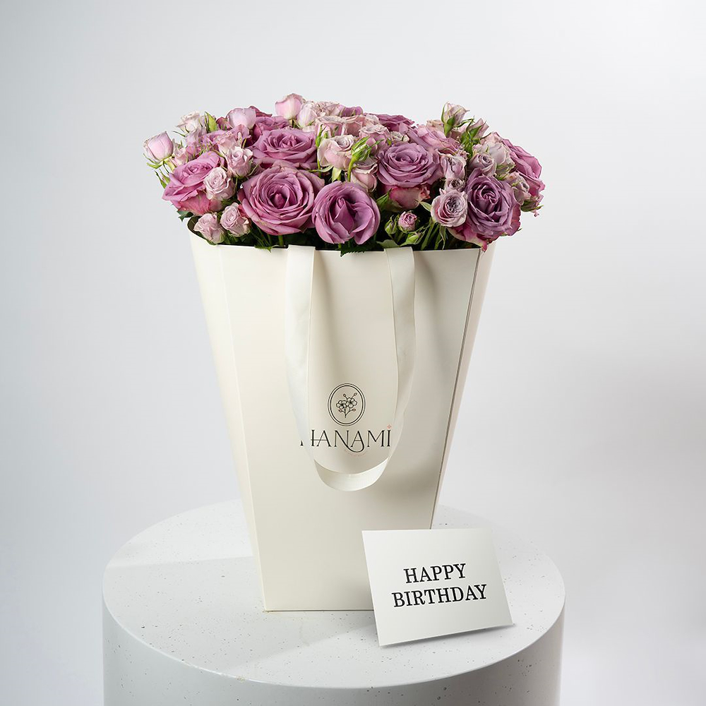 A bouquet that contains roses and baby roses, beautifully arranged in a bag.