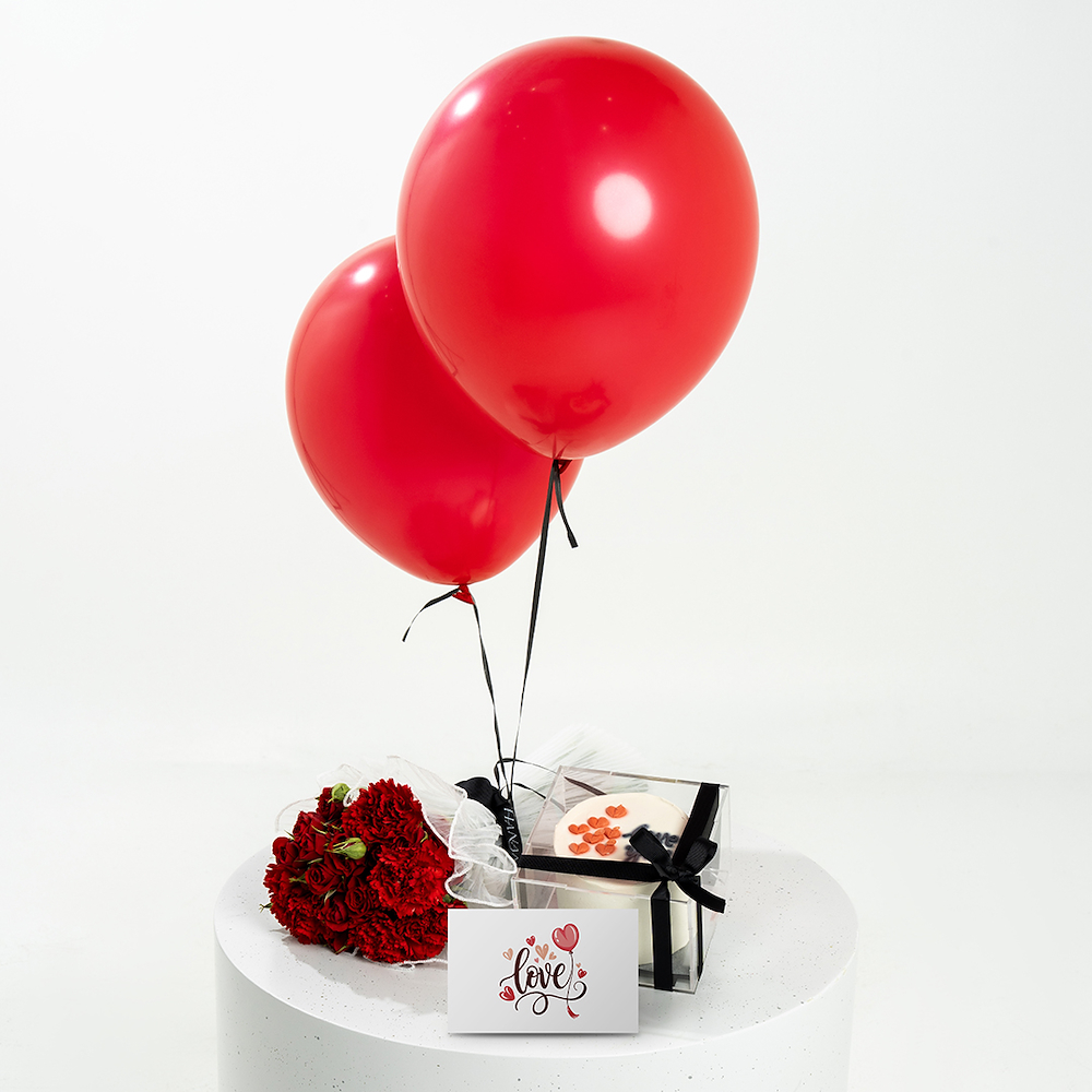 A hand bouquet that contains red baby roses, carnations, with balloons and a cake, beautifully arranged to create a charming and romantic floral display. Perfect for expressing love and appreciation.