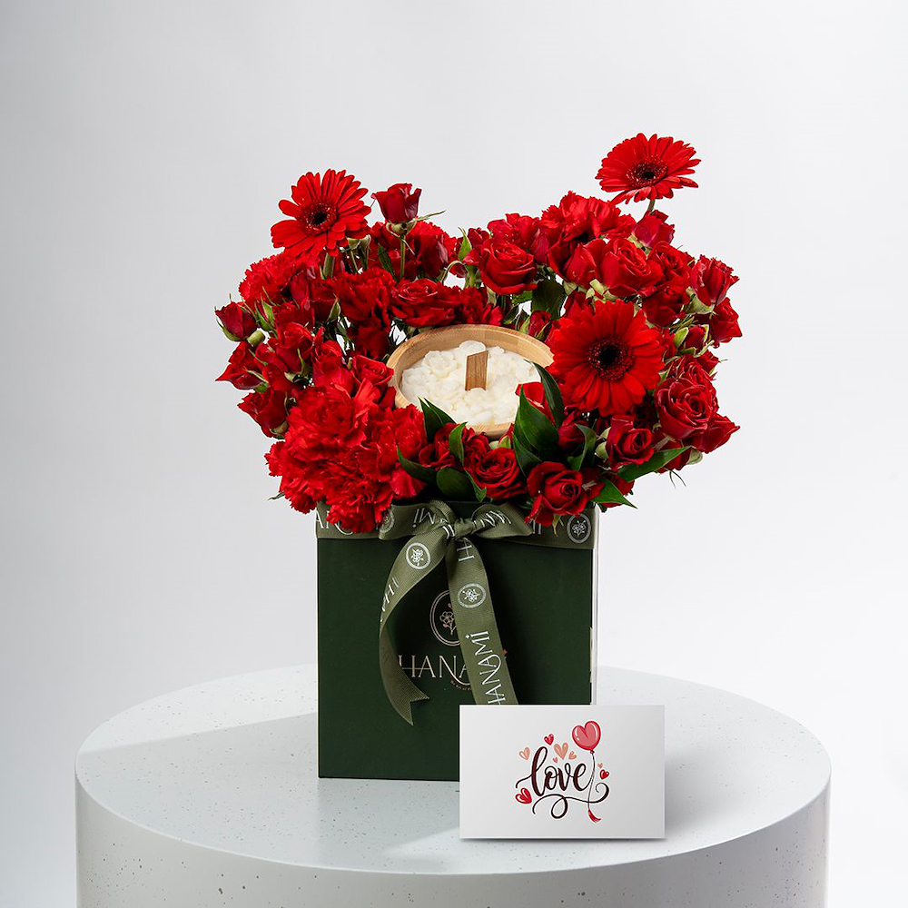 A box that contains red baby roses, gerberas, and carnations, beautifully arranged with a scented candle to create a charming and romantic floral display. Perfect for expressing love and appreciation.