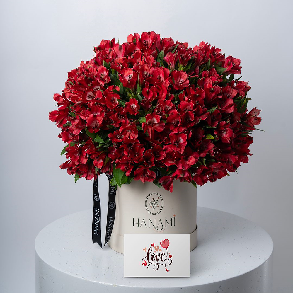 A box that contains red alstroemerias, beautifully arranged to create a charming and romantic floral display. Perfect for expressing love and appreciation.