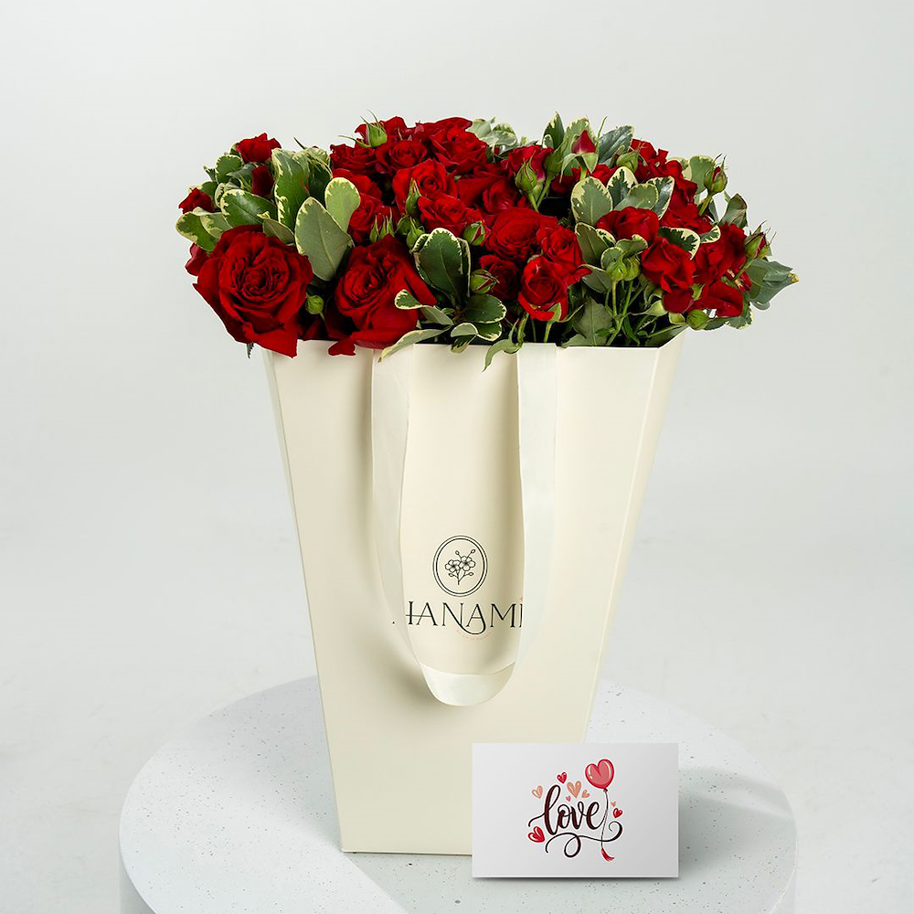 A bag containing red roses, baby roses, and pittosporum leaves, beautifully arranged. Perfect for enlightening your loved one's day.