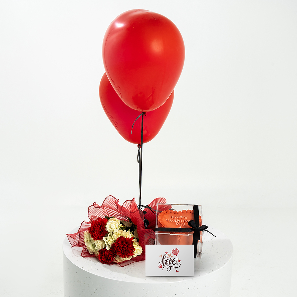 A bouquet containing balloons, a cake, carnations, and baby roses, all beautifully arranged to create a fun and celebratory night. Perfect for marking joyful moments on Love Day.