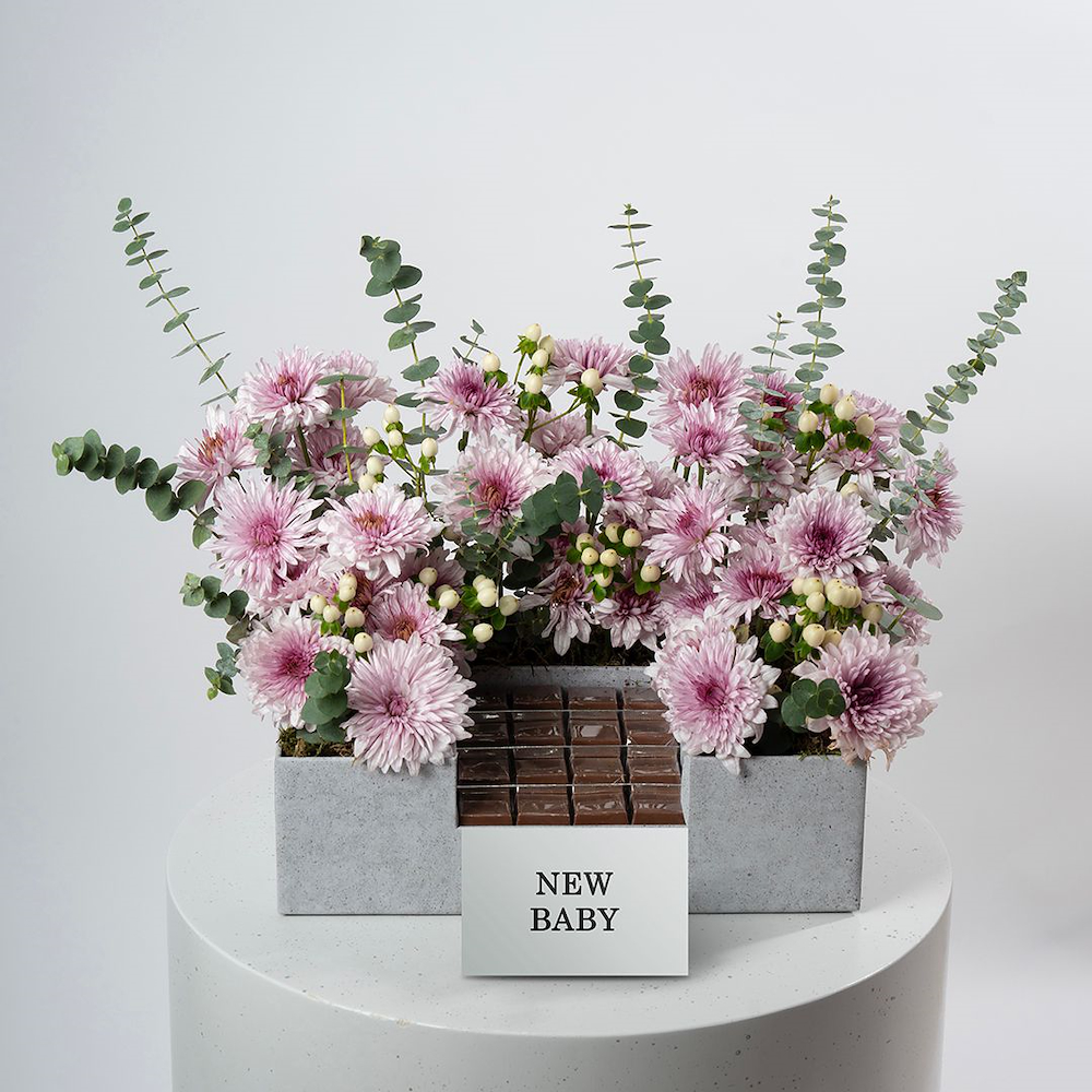 A bouquet containing chrysanthemums and hypericum with Belgian chocolates, beautifully arranged in a box.