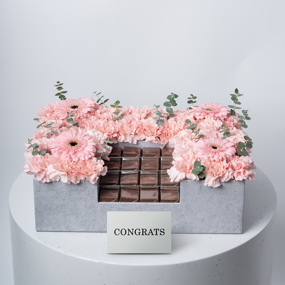 A chocolate box arranged with vibrant carnations and gerberas, beautifully arranged with a touch of greenery. A cheerful and elegant gift, perfect for congratulating someone.