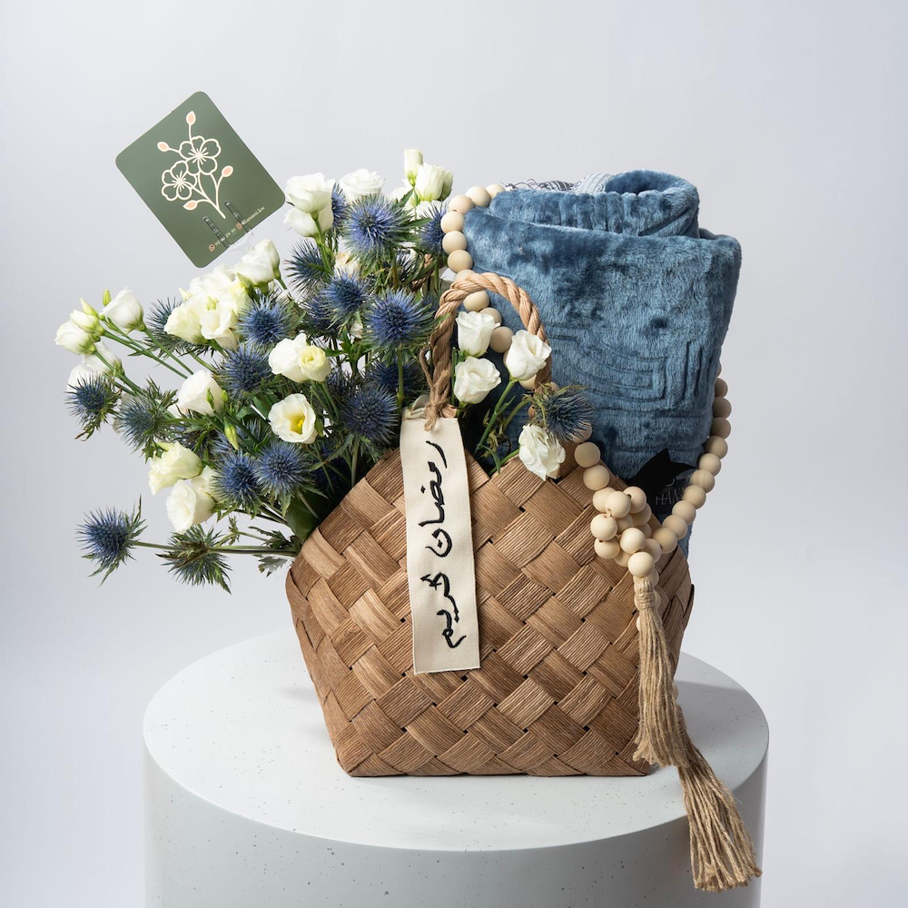 A basket containing eustoma, hypericum, eryngium, a prayer mat, and a rosary, beautifully arranged.