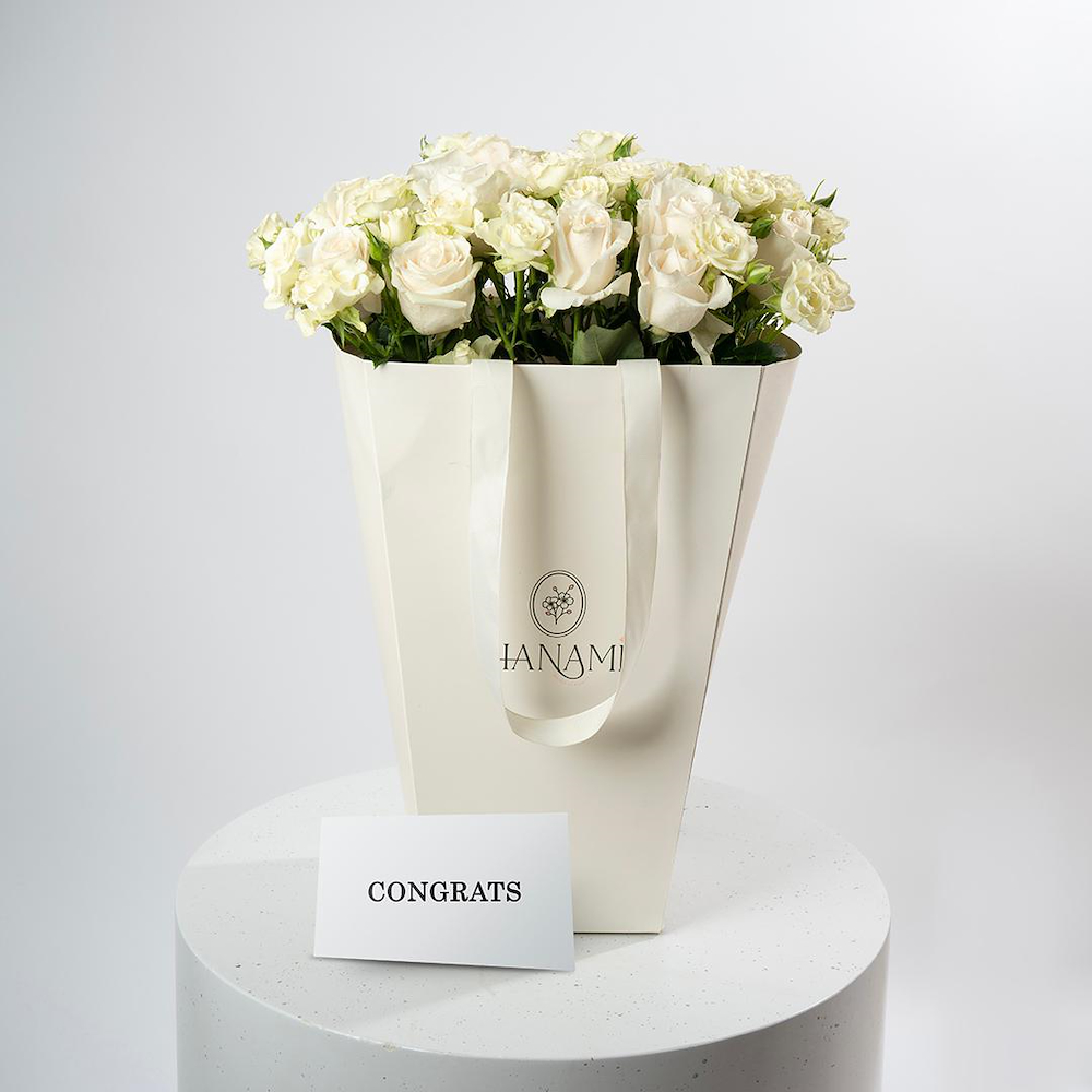 A bouquet that contains white roses and baby roses, beautifully arranged in a bag.