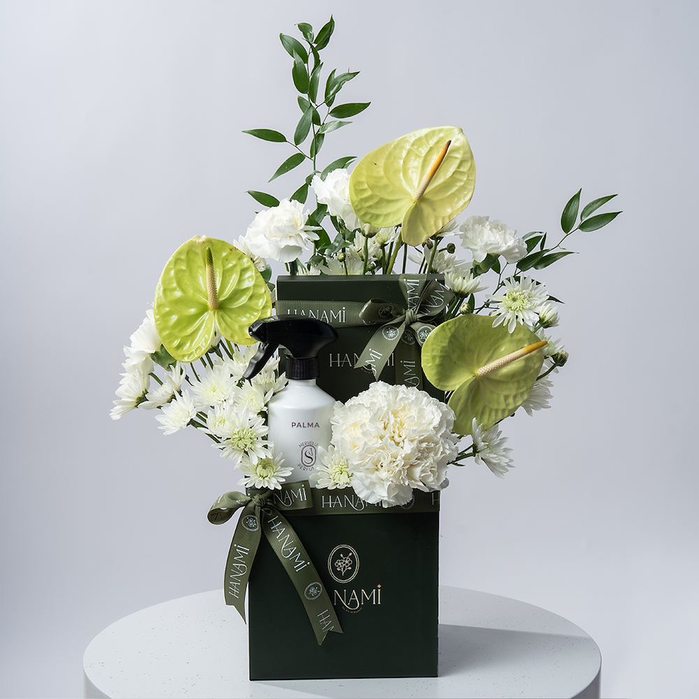A box that contains anthurium, carnation, chrysanthemum, 18 pieces of belgian chocolate, and a marvi perfume sprayer, beautifully arranged, perfume sprayer, palma, 100ml, fragrance family, warm, oriental, woody, top notes, pink pepper, bergamot, heart notes, oud, amber, base notes, linden flower, musk, indian patchouli.