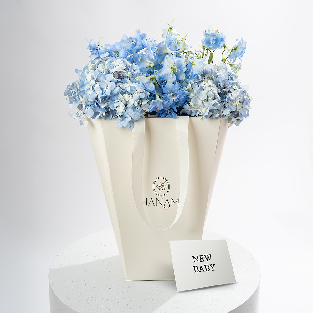 A bag containing hydrangeas and delphiniums, beautifully arranged.