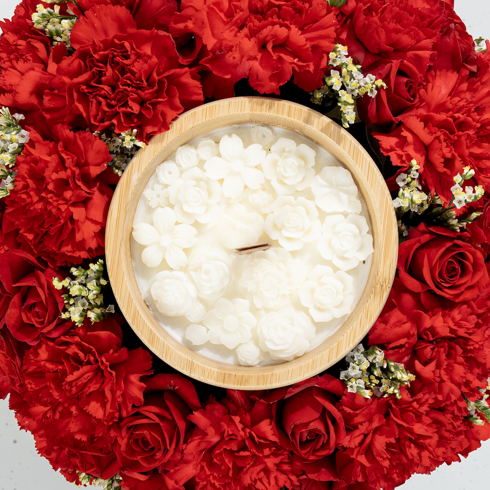A box containing carnations, baby roses, and a scented candle, beautifully arranged.