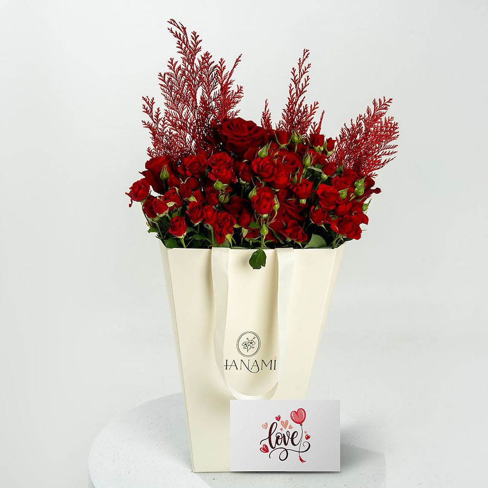 A bag that contains red roses, baby roses, and conifer, beautifully arranged to create a charming and romantic floral display. Perfect for expressing love and appreciation.