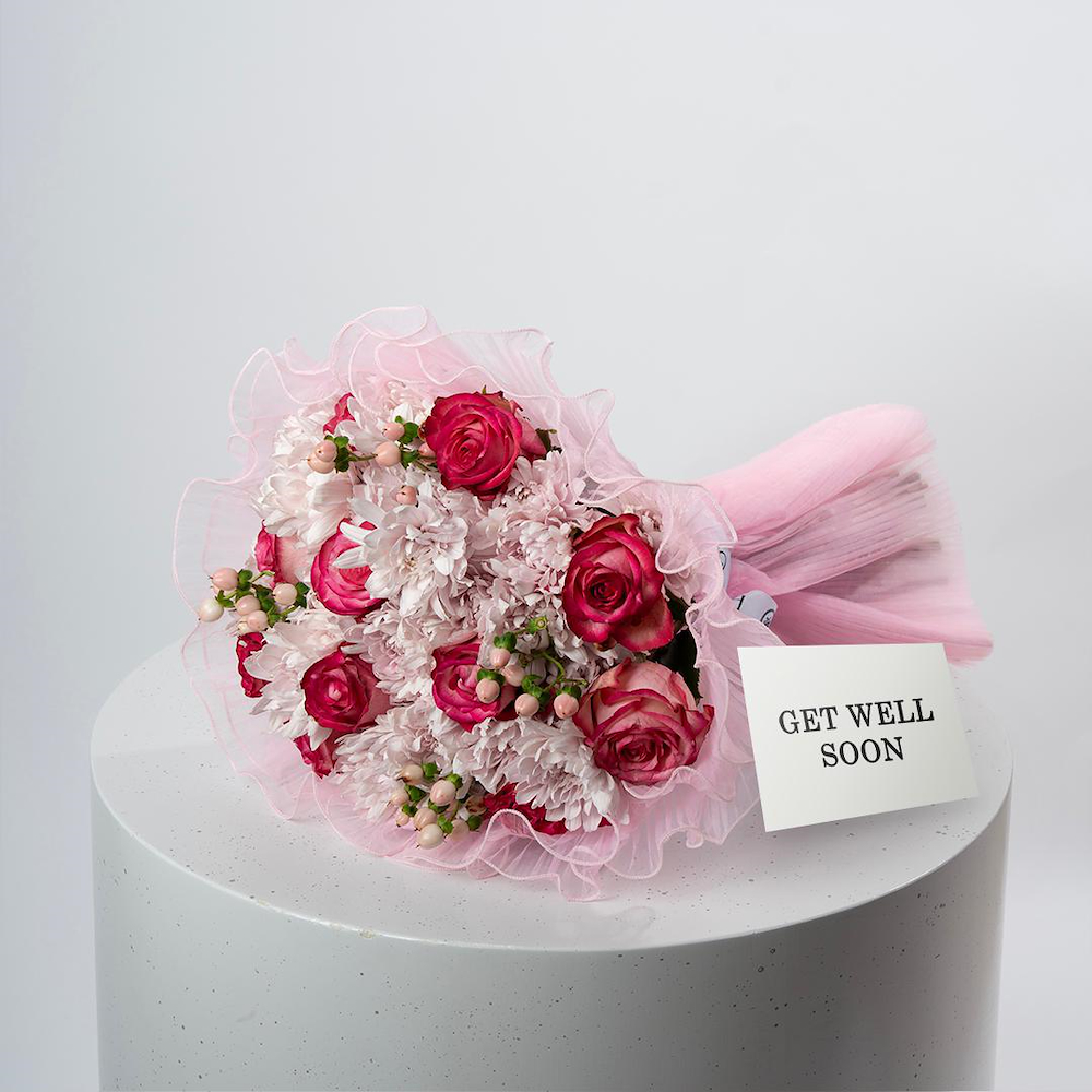 A hand bouquet containing roses, chrysanthemums, and hypericum, beautifully arranged.
