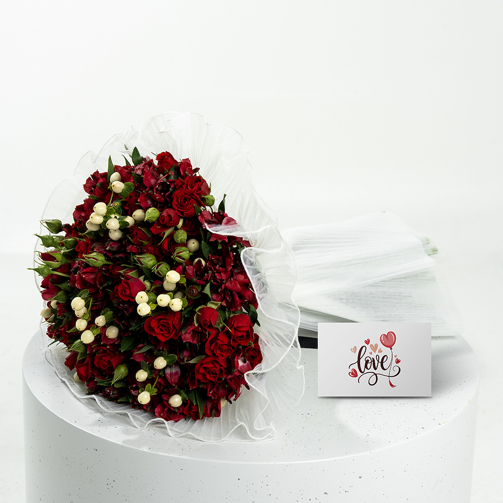A hand bouquet that contains roses, alstroemerias, and hypericum, beautifully arranged to create a charming and romantic floral display. Perfect for expressing love and appreciation.