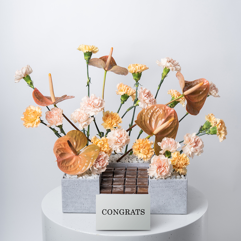 A chocolate box featuring vibrant anthuriums and carnations, paired with delicious chocolates, all beautifully arranged in a stylish box. A sweet and elegant gift for any occasion.