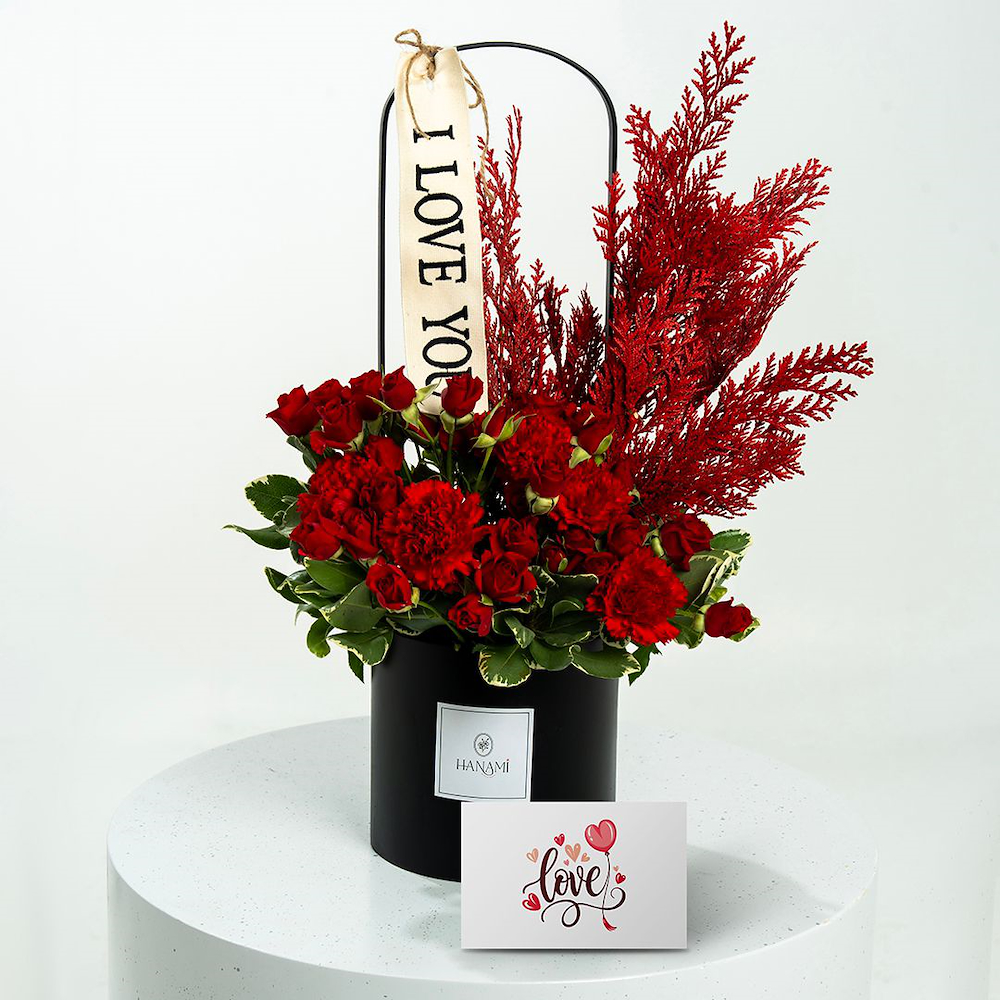 A basket that contains red roses, carnations, and conifer, beautifully arranged to create a charming and romantic floral display. Perfect for expressing love and appreciation.