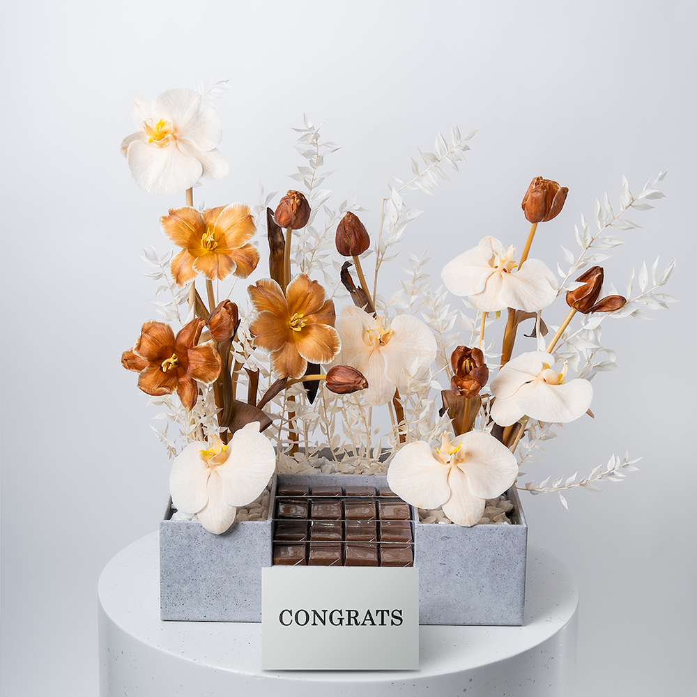 A chocolate box featuring preserved ruscus, tulips, and orchid cut flowers, paired with delicious chocolates, all beautifully arranged in a stylish box. A thoughtful and elegant gift for congratulations.
