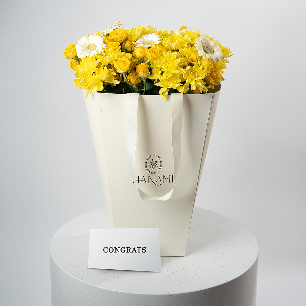 A bouquet that contains gerberas, chrysanthemums, and baby roses, beautifully arranged in a bag.
