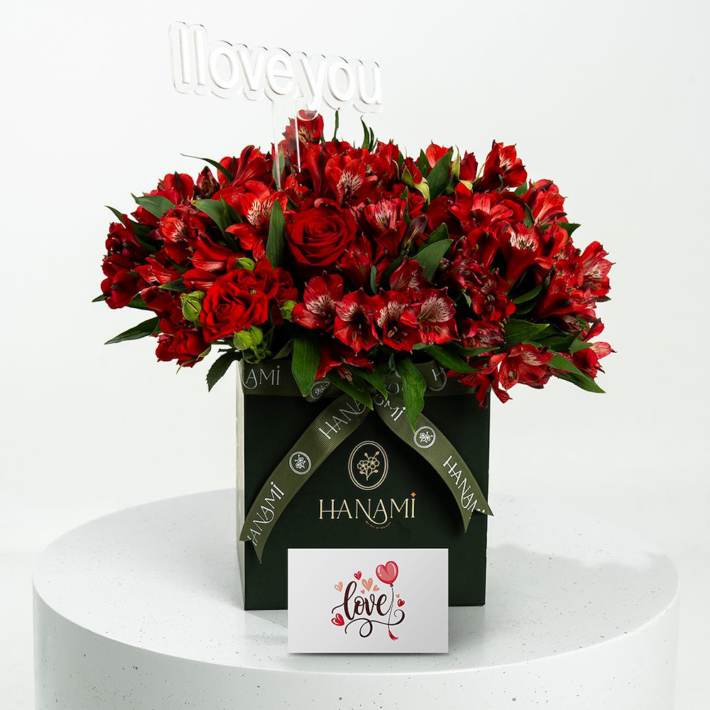 A box containing red roses and alstroemerias, beautifully arranged. Perfect for enlightening your loved one's day.
