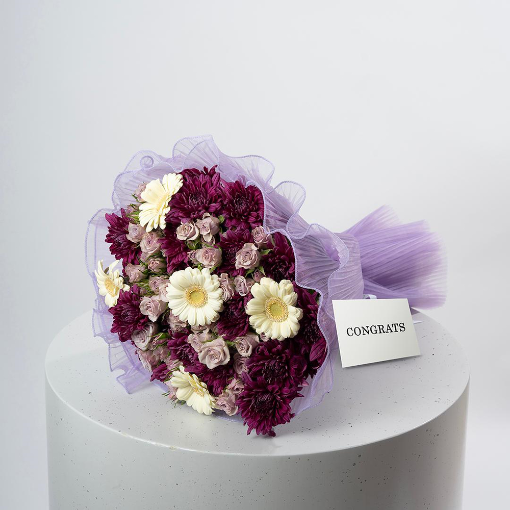 A hand bouquet containing baby roses, chrysanthemums, and gerberas, beautifully arranged.