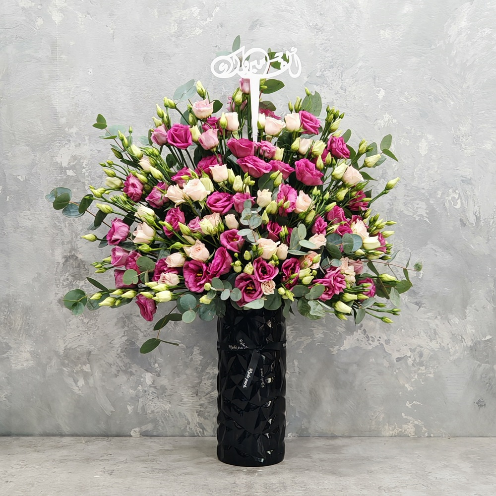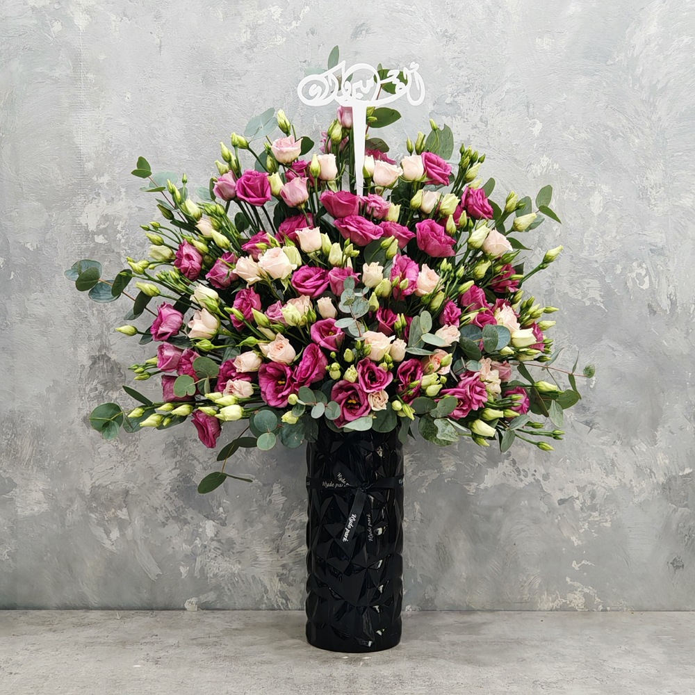 A vase filled with eustomas and baby roses and eucalyptus.