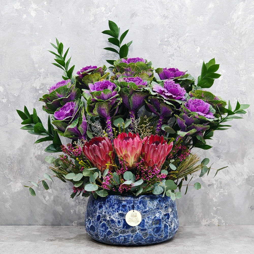 A bouquet containing brassica, protea, and eucalyptus leaves, arranged elegantly in a blue vase.