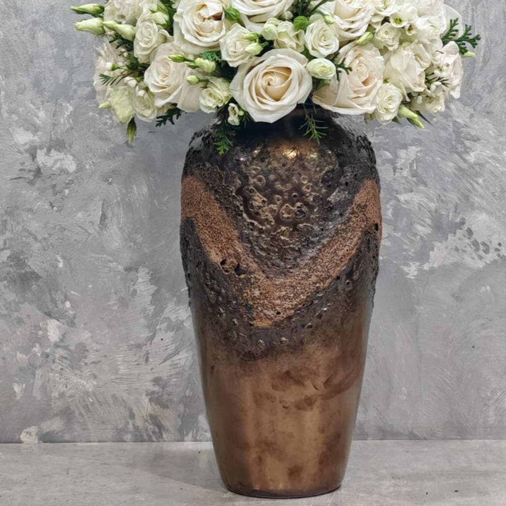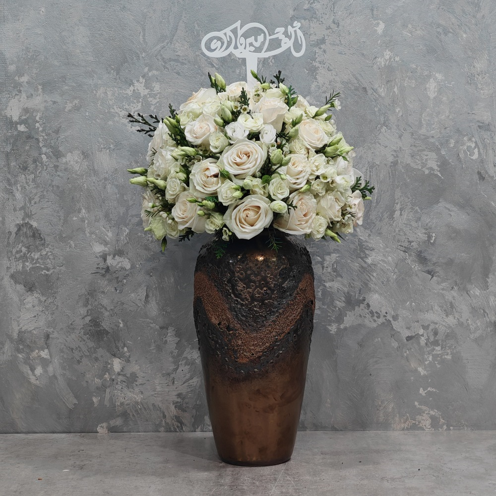 An elegant vase featuring roses and baby roses.