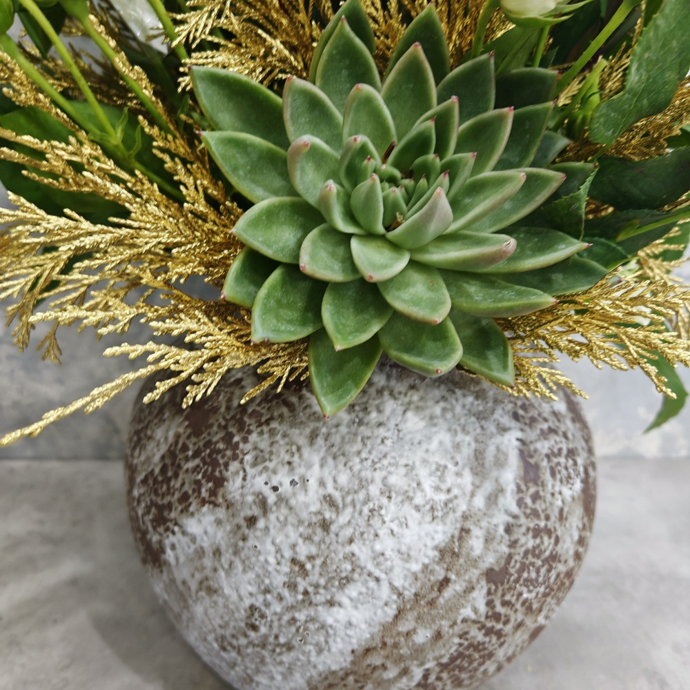 A bouquet containing orchid flowers, sunset, echeveria, and ruscus leaves, arranged beautifully in a vase.