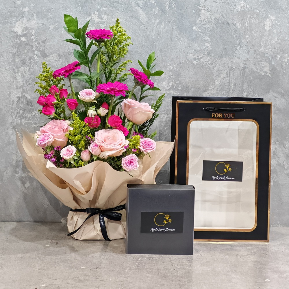 A bouquet of gerbera fuchsia, ruscus and pink roses with chocolates.