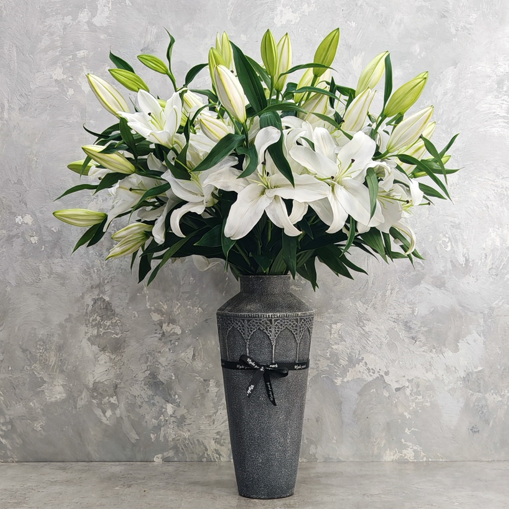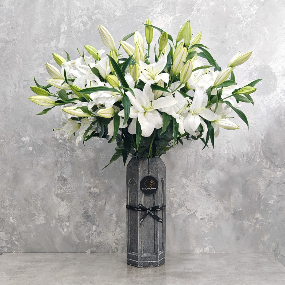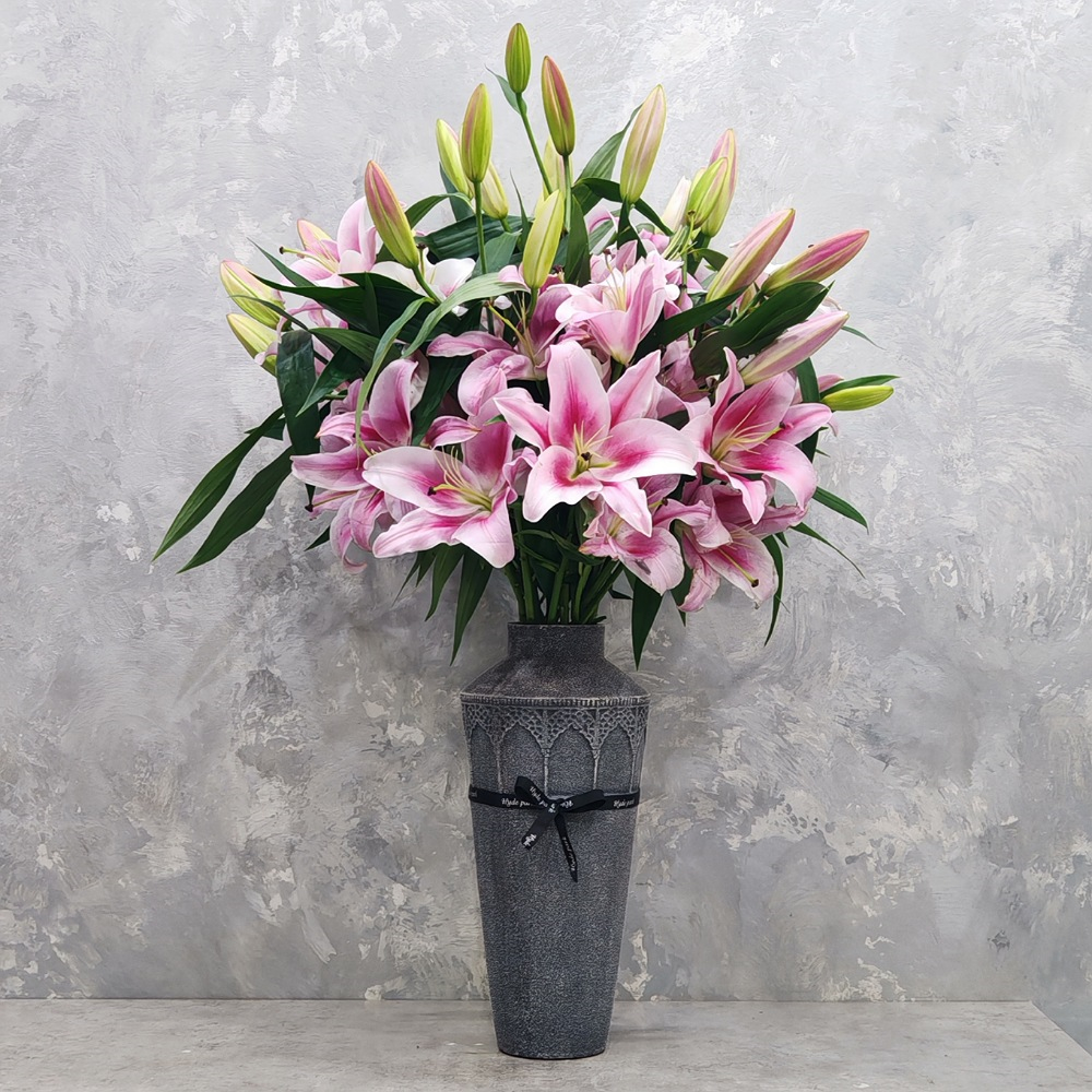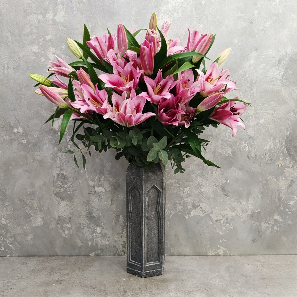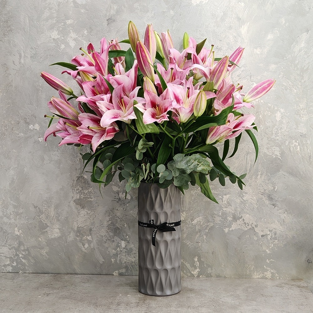 This bouquet contains rose, baby rose, brassica, and alstroemeria flowers.