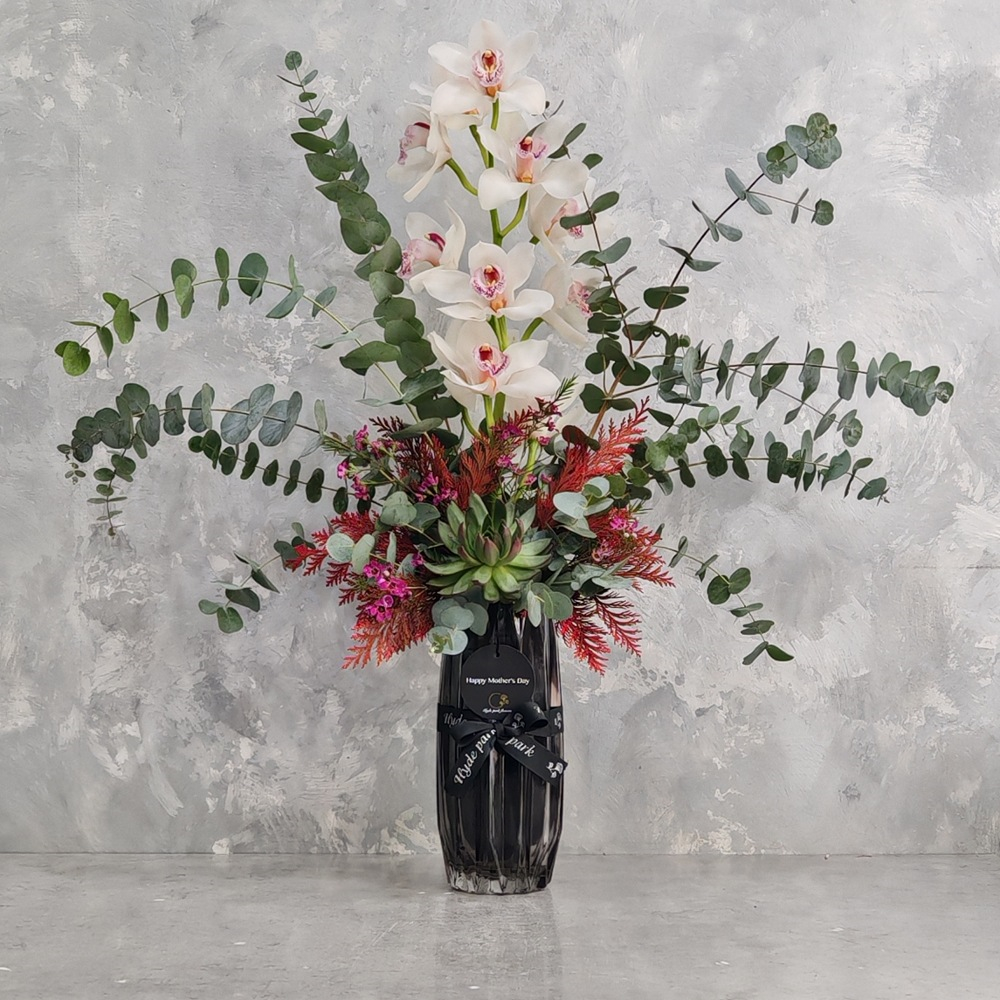 A bouquet of cymbidium, eucalyptus, echeveria and wax.