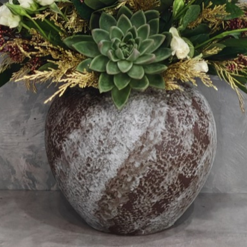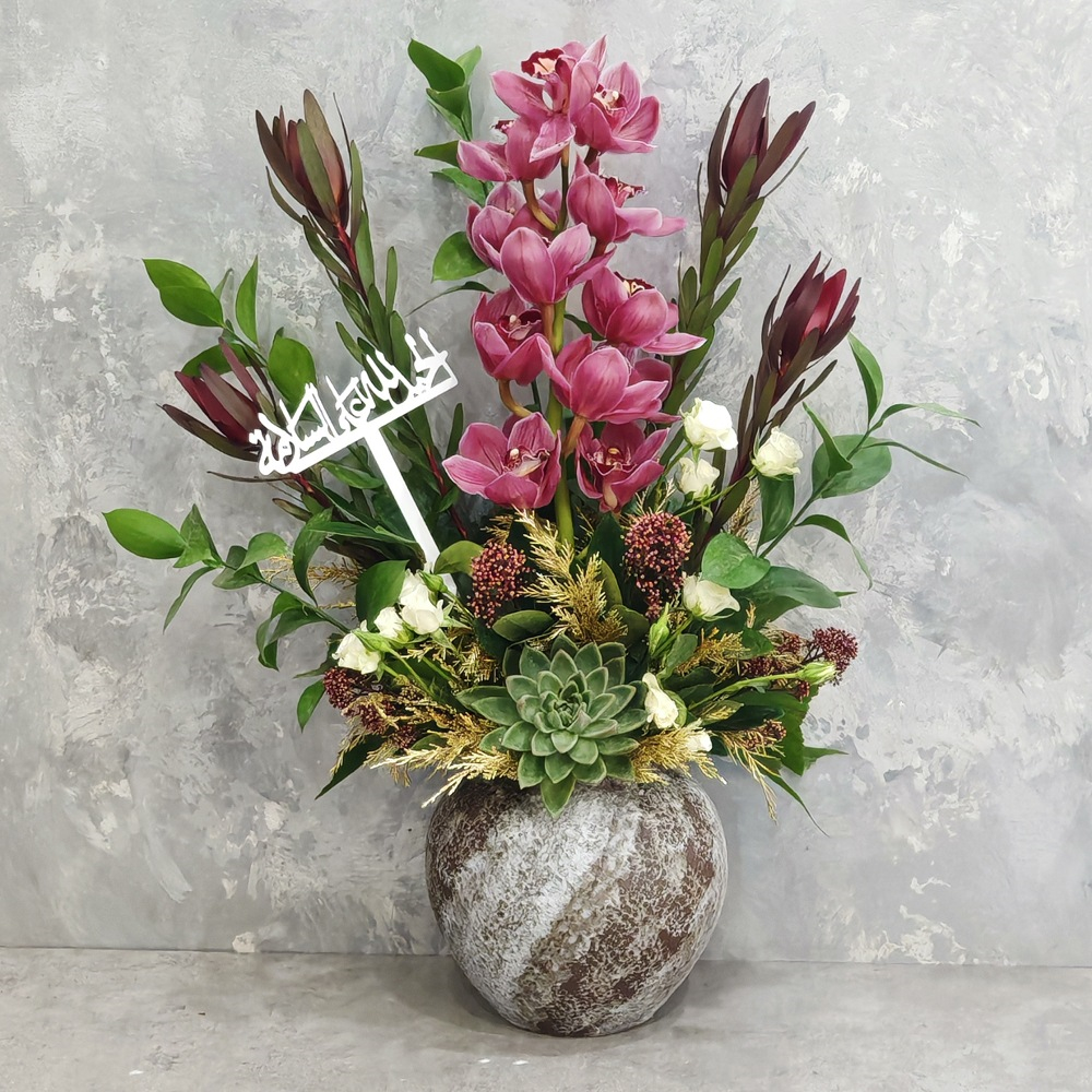 A bouquet containing cymbidium flowers, echeveria, and ruscus leaves, arranged beautifully in a vase.