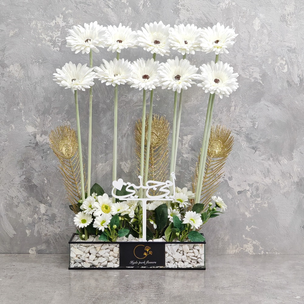 A bouquet containing white artificial gerberas, arranged beautifully in a tray.