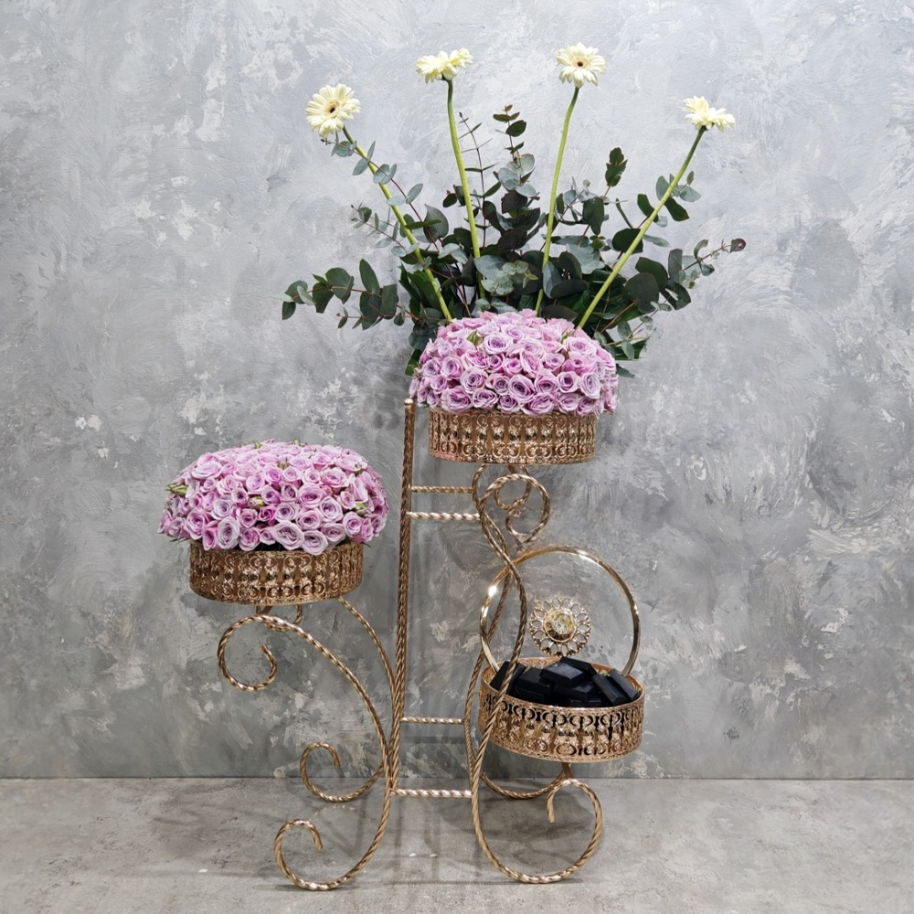 A bouquet containing baby roses, gerberas, and eucalyptus leaves, arranged beautifully in a stand. Comes with chocolates.