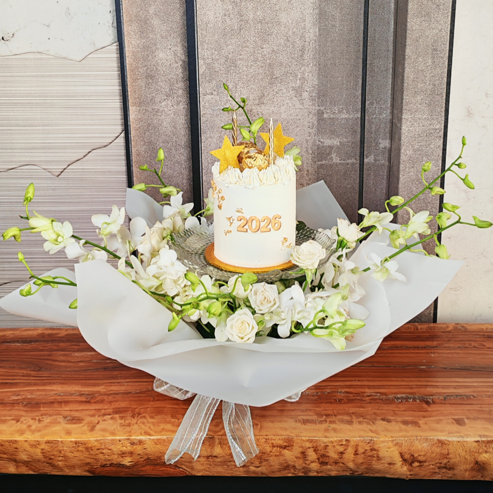 This bouquet features baby roses, baby orchids, and hydrangeas, paired with a delicious, beautifully designed cake.