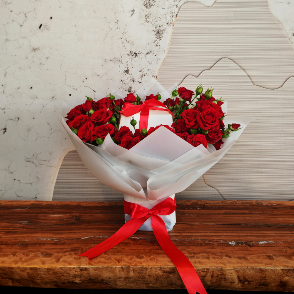 This hand bouquet features baby roses paired with a delicious cake.