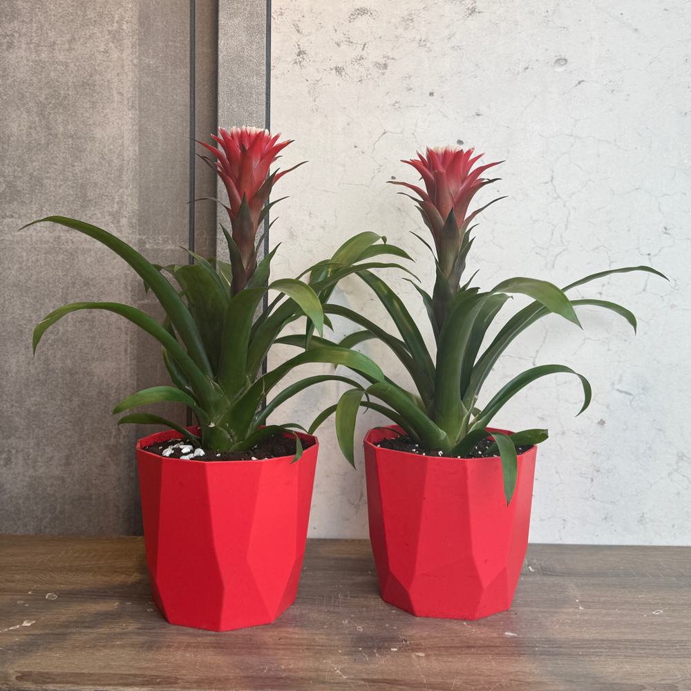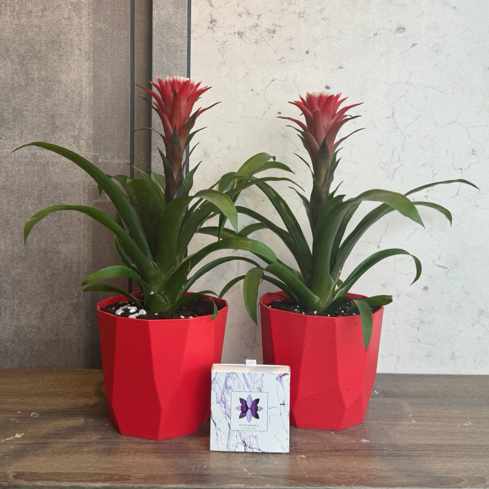 An elegant twin vases featuring brom plants.