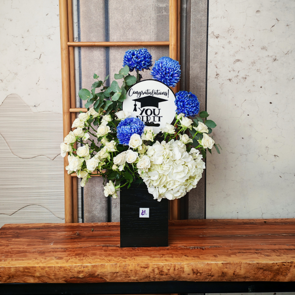 An elegant bouquet filled with white orchid plant with chocolates.