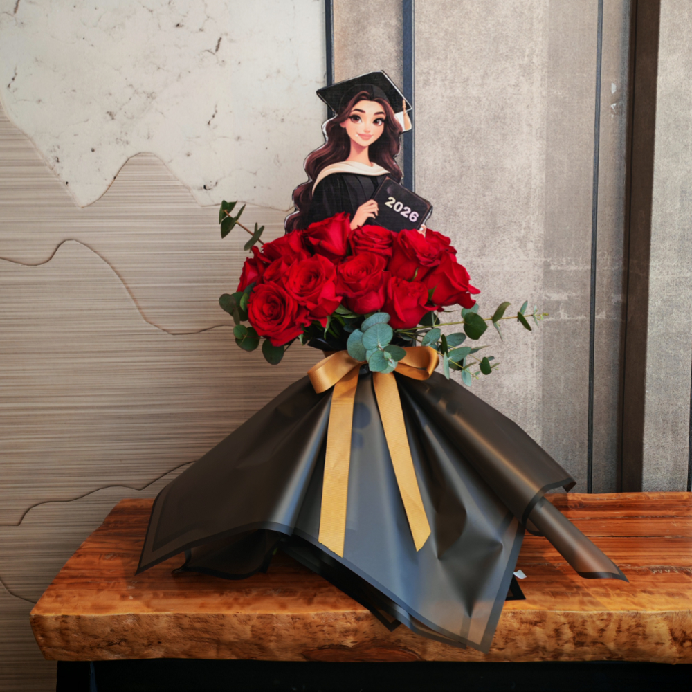 An elegant and beautiful bride-shaped stand contains chrysanthemum flowers.