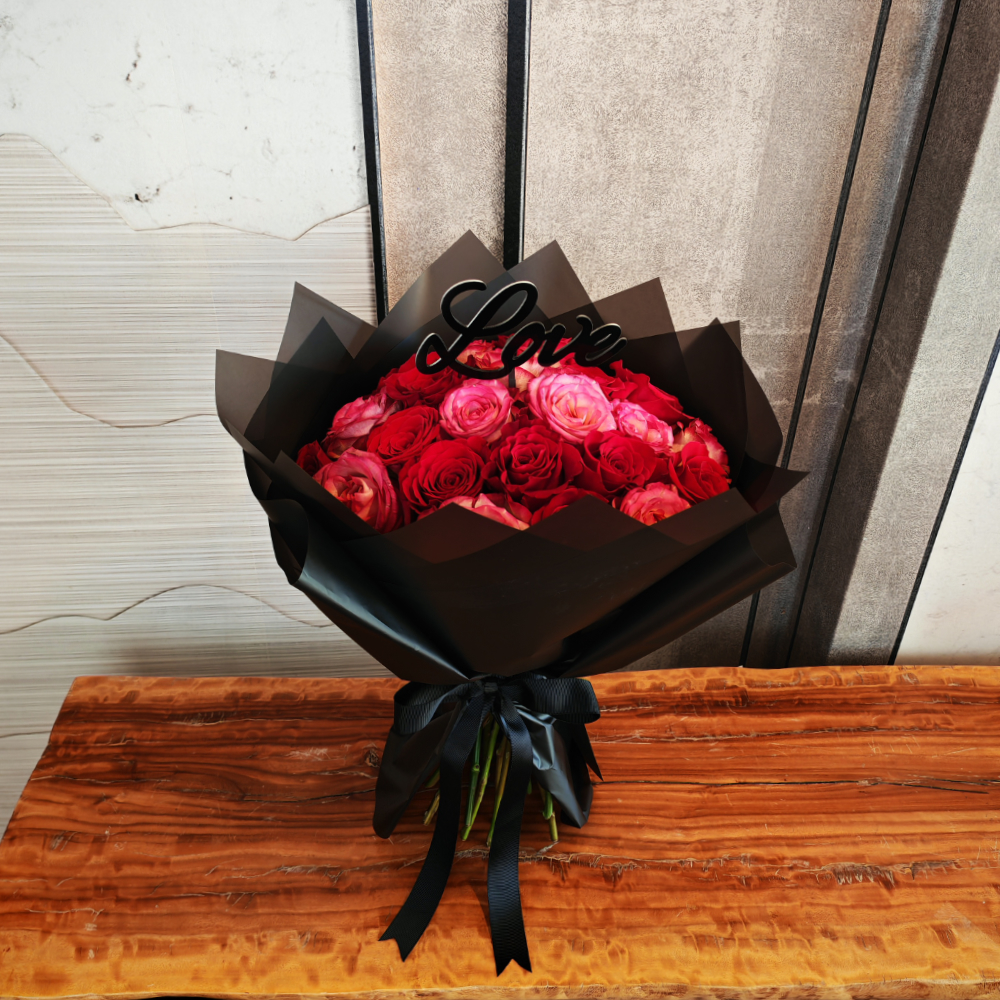 This beautiful hand bouquet contains roses.