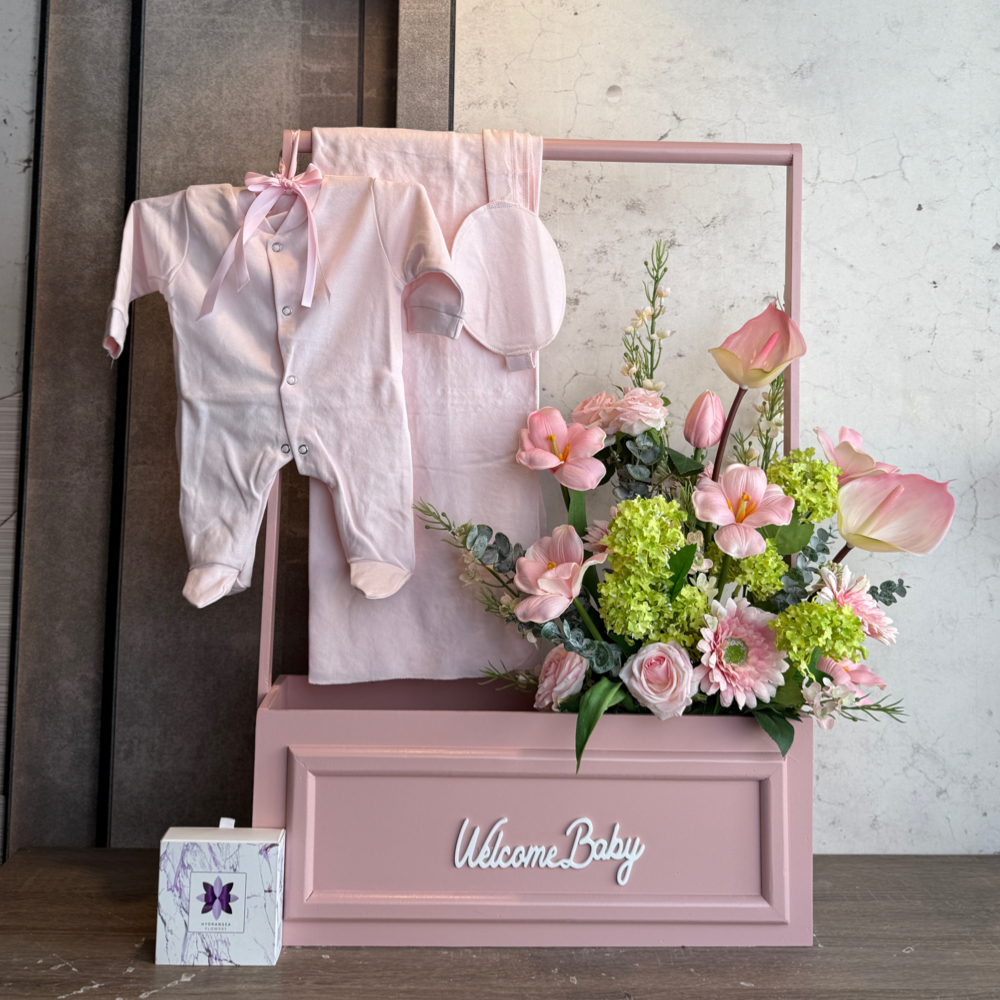 A bouquet that contains baby roses, hydrangeas, and baby orchids in a beautiful arrangement.