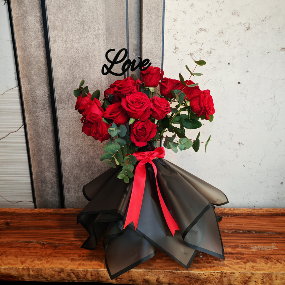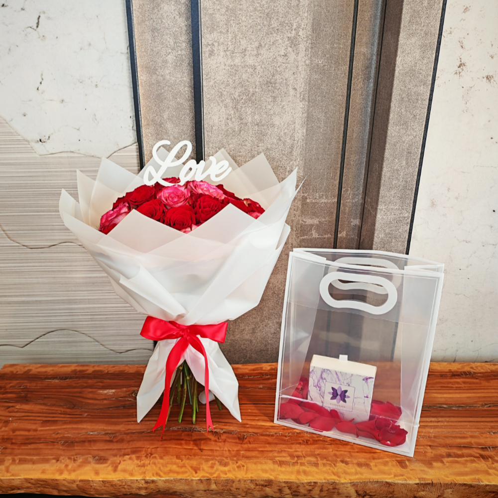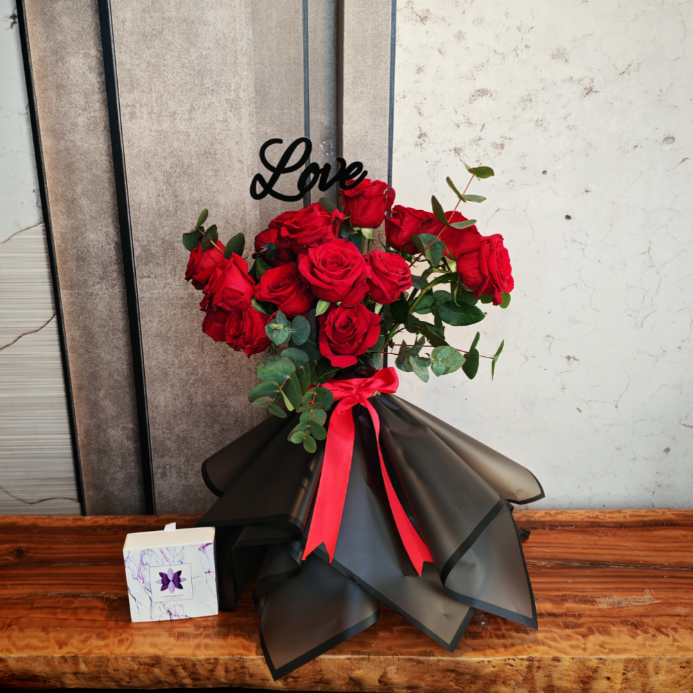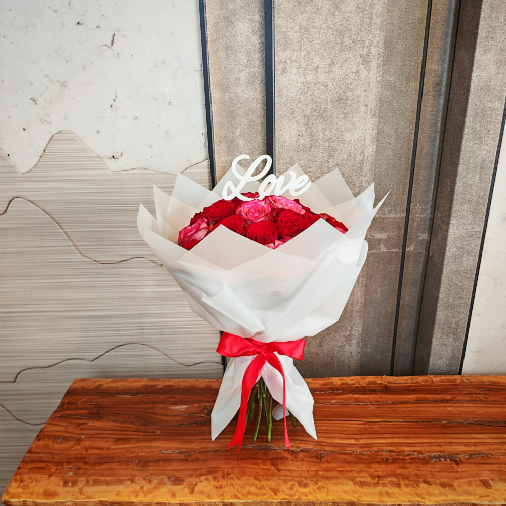A bouquet that contains baby roses, hydrangeas, and baby orchids in a beautiful arrangement.