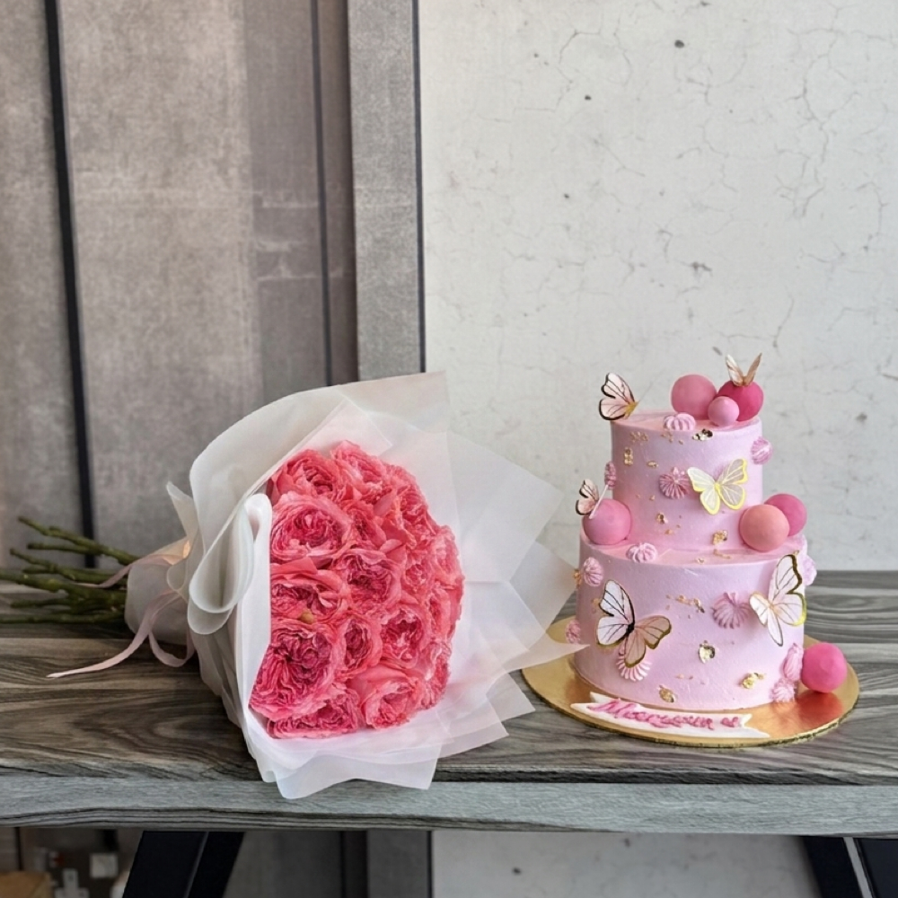 This bouquet contains beautiful delphinium, rose, and gerbera flowers.