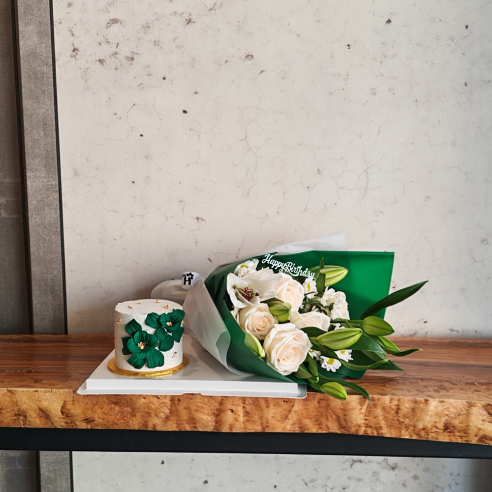 A box filled with a bouquet of roses and lilies with a delicious cake.
