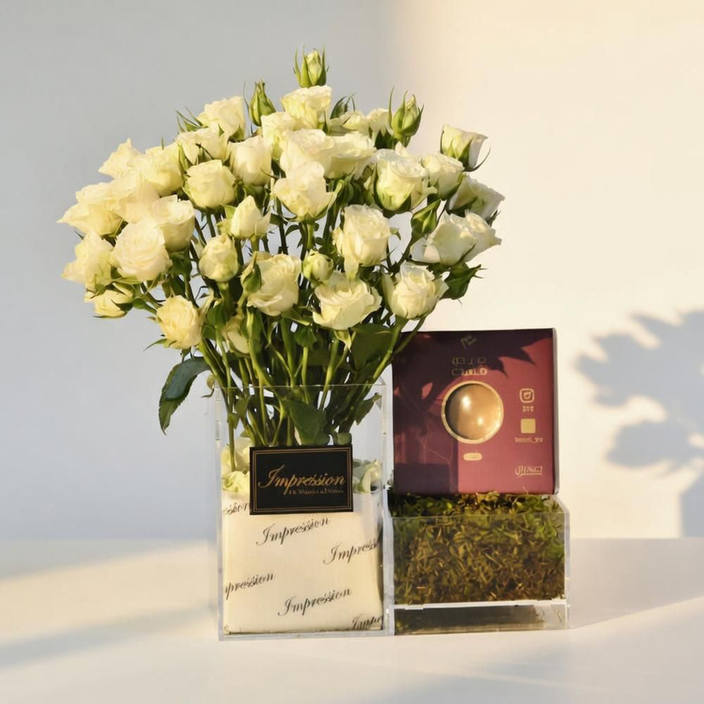 An elegance with a professionally arranged bouquet of white baby roses, accompanied by a box of premium pure Iranian saffron weighing 5g, the perfect blend of beauty and luxury.